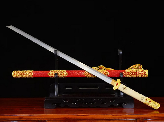 商品属性 [总长] 103cm [刃长] 71cm [柄长] 26cm [刃厚] 0.7cm [硬度] 60HRC以上 [刃材] 大马士革钢 [高级复合锻打] 三枚合夹钢 [鞘材] 高档珍珠鱼皮 [柄材] 珍珠鱼皮 [装具] 鎏金 [工艺] 覆土烧刃—回火 [锻打程度] 十六道纯手工研磨+上研 [赠品] 锦盒-刀油-收藏证书-刀架 [重量] 1.9kg