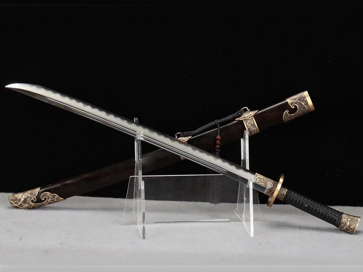 商品属性 [总长] 98cm [刃长] 72cm [柄长] 20cm [刃宽] 3.6cm [刃厚] 0.7cm [硬度] 60HRC以上 [刃材] 百炼钢 [刃表面] 一级精磨 [鞘材] 黑檀木 [装具] 铜装 [工艺] 覆土烧刃—回火 [锻打程度] 十四道纯手工研磨 [赠品] 锦盒-刀油-收藏证书-刀架 [重量] 1.9kg