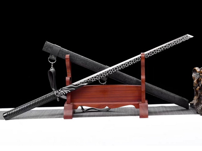 商品参数 总长:98cm 刃长:67cm 柄长:24cm 刃宽:3.2cm 刃厚:0.5cm 硬度:56HRC 刃材:高碳钢T8 鞘材:实木包皮革 装具:合金 赠品:剑油-收藏证书-剑架 重量:1kg