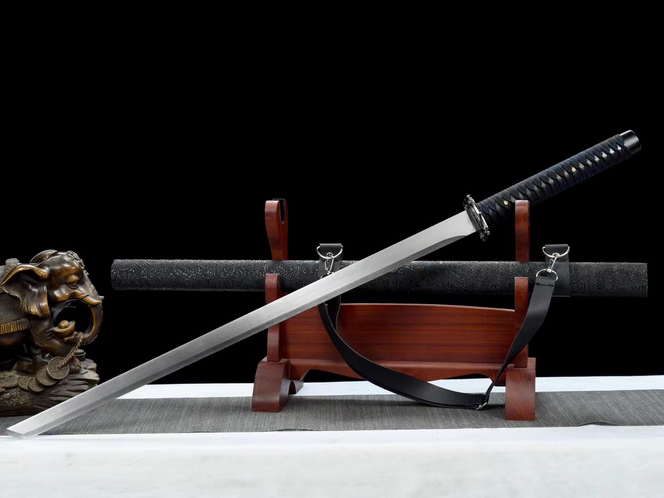 商品参数 总长:99cm 刃长:67cm 柄长:25cm 刃宽:3.2cm 刃厚:0.5cm 硬度:56HRC 刃材:高碳钢 鞘材:实木包皮革 装具:合金 赠品:剑油-收藏证书-剑架 重量:1.1kg