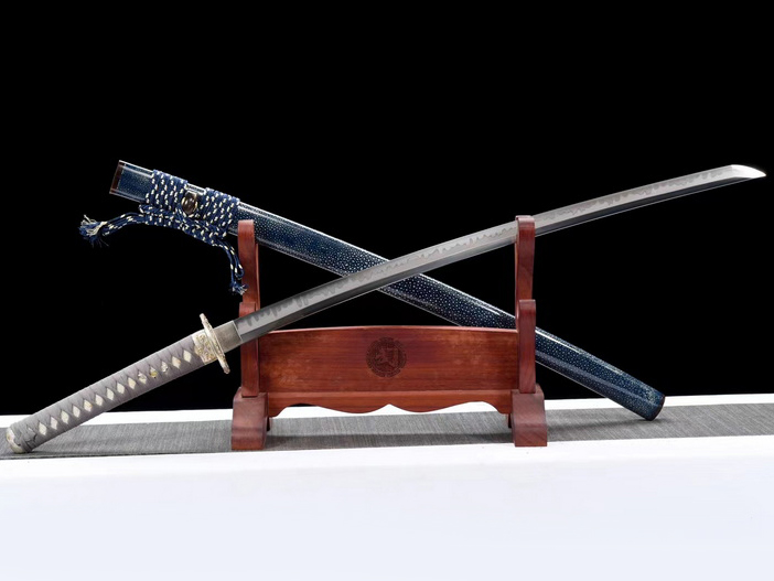 商品参数 T10烧刃日式上研武士刀 纯铜精雕鎏金银套装〖性能〗手工18道研磨纯锋利,镜面研磨真横手工艺,硬度60°砍铁不伤刃,刚柔相济!超高性价比高!作品总长103cm、刃长71cm、柄长27cm、刃宽3.2cm,净重1.45㎏;刀刃采用T10钢上研,纯手工古法工艺锻打制作,手柄贴珍珠鱼皮,手工缠绕进口绒皮,青皮木全包蓝色鱼皮鞘【鲤口、栗行、挡均镶嵌牛角】