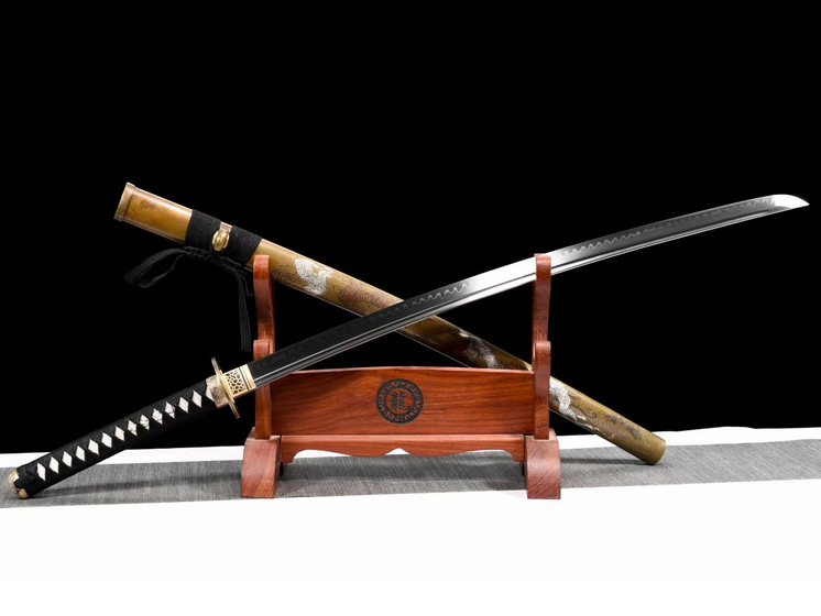 商品参数 全长102cm、柄长27.5cm、刃长73.5cm、刃宽3.2cm、刃厚0.8cm、重约1.65kg。 刀鞘: 黄铜复古雕刻 刀柄: 珍珠鱼皮包实木 刀刃: T10覆土烧刃 配件: 纯铜复古