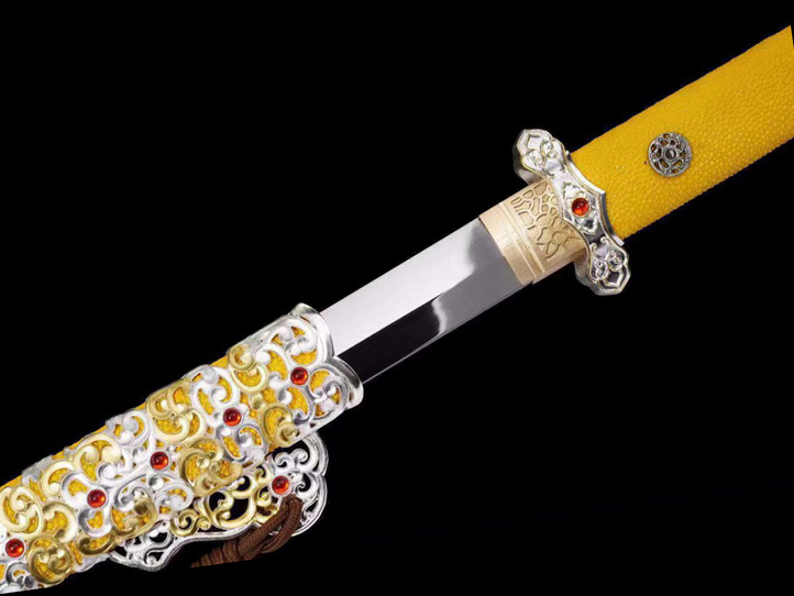 商品参数 尺寸、全长103cm 、韧长71cm 、柄长25cm 、韧宽3.2cm,厚0.70cm 、带鞘全重1.80Kg、净重1.00Kg、硬度60、收藏 防身 乔迁送礼 武术健身 精美摆设、材质:S1095镜光研磨刀条:纯黄铜鎏亮金亮银精修装具、精细作工、鞘材:内实木外包黄珍珠鱼皮、高端送礼首选、赠送锦盒刀油刀布