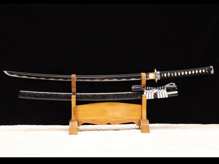 商品参数 26寸5160白铜装镜面刃白研磨工艺武士刀 〖特点〗:此刃型为大V面平整锋利劈砍阻力小,整体刀型由刀簇向刀尖径向逐渐加宽,轴向渐薄锻打,采用油水淬火,高弹性,高硬度,可砍铁秒过9听装啤酒,刃口完好无损。 〖总长〗103cm 〖刃长〗72cm 〖刃宽〗3.2cm 〖刃厚〗0.7cm 〖垫纸〗人工鱼皮 〖木材〗柏木油漆 〖装具〗铜装 〖工艺〗5160弹簧钢 工艺,十八道手工水磨