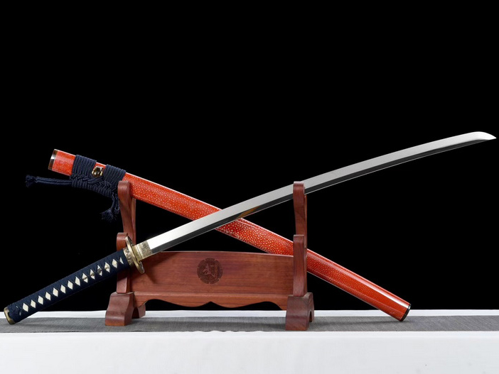商品参数 高性能锋钢锻打韧性弯曲90度不变形,硬度高达60°砍铁不伤刃。 带鞘全长103厘米,刃长71厘米,柄长26.5厘米,刃宽3.2厘米,刀身手工锻打超高亮镜面抛光,纯铜精雕套装,青皮木全包红色珍珠鱼皮鞘【鲤口、栗行、挡均为黄牛角】搭配精美粗下绪