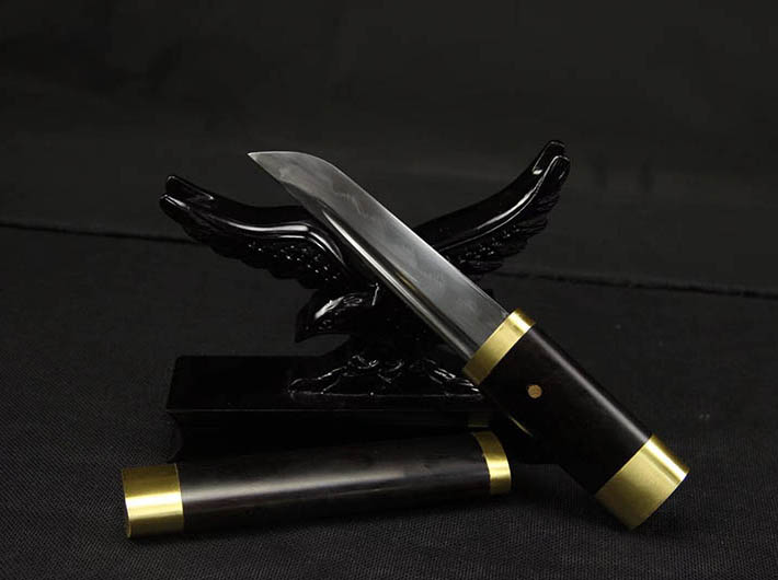 商品属性 [总长] 28cm [刃长] 14cm [柄长] 10cm [刃宽] 3.0cm [刃厚] 0.6cm [硬度] 60HRC [刃材] 花纹钢 [刃表面] 一级精磨 [鞘材] 黑檀木 [柄材] 黑檀木 [装具] 包铜 [工艺] 覆土烧刃—回火 [锻打程度] 十三道纯手工研磨 [赠品] 锦盒-刀油-收藏证书