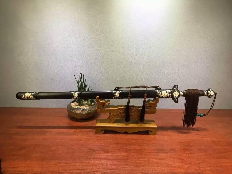 商品属性 [总长] 102cm [刃长] 77cm [柄长] 22cm [刃宽] 3.7cm [刃厚] 0.7cm [硬度] 59HRC [刃材] 花纹钢 [刃表面] 四面研磨 [鞘材] 乌木 [柄材] 乌木 [装具] 合金镀银 [工艺] 淬火(盐水)—回火 [锻打程度] 十三道纯手工研磨 [赠品] 锦盒-刀油-收藏证书-刀架