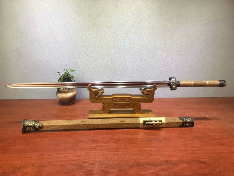商品属性 [总长] 108cm [刃长] 77cm [柄长] 27cm [刃宽] 3.5cm [刃厚] 0.8cm [硬度] 58HRC [刃材] 花纹钢 [刃表面] 发红处理 [鞘材] 花梨木 [柄材] 花梨木 [装具] 鎏金 [工艺] 淬火(油)—回火 [锻打程度] 十三道纯手工研磨 [赠品] 锦盒-刀油-收藏证书-刀架