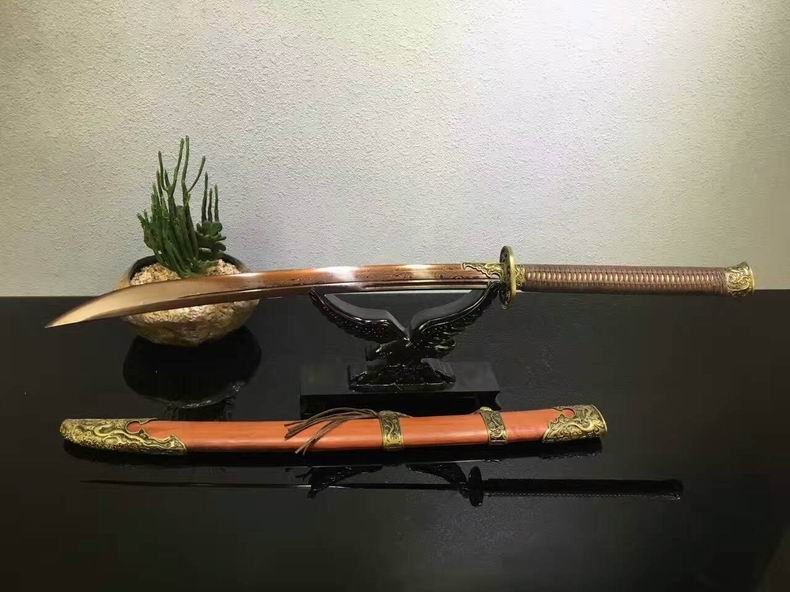商品属性 [总长] 91cm [刃长] 53cm [柄长] 35` [刃宽] 3.7 [刃厚] 0.75cm [硬度] 57HRC [刃材] 花纹钢 [刃表面] 发红处理 [鞘材] 红木 [柄材] 红木 [装具] 铜锌合金 [柄卷] 布绳品 [下绪] 布绳品 [工艺] 淬火(水)—回火 [锻打程度] 十三道纯手工研磨 [赠品] 锦盒-刀油-收藏证书-刀架