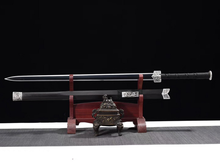 商品参数 硬度:59HRC 刃材:花纹钢 鞘材:乌木 装具:合金镀银 工艺:淬火(盐水)—回火 锻打程度:十三道纯手工研磨 赠品:锦盒-刀油-收藏证书-刀架