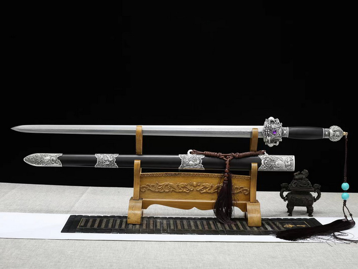 商品属性 [总长] 105cm [刃长] 75cm [柄长] 28cm [刃厚] 0.75cm [硬度] 59HRC [刃材] 花纹钢 [鞘材] 乌木 [装具] 银装 [工艺] 淬火(油)—回火 [锻打程度] 十三道纯手工研磨 [赠品] 锦盒-刀油-收藏证书-刀架
