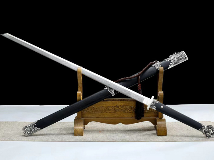 商品参数 总长:106cm 刃长:75cm 柄长:26cm 刃厚:0.7cm 硬度:59HRC 刃材:花纹钢 鞘材:乌木 装具:镀银 工艺:淬火(盐水)—回火 锻打程度:十三道纯手工研磨 赠品:锦盒-刀油-收藏证书-刀架